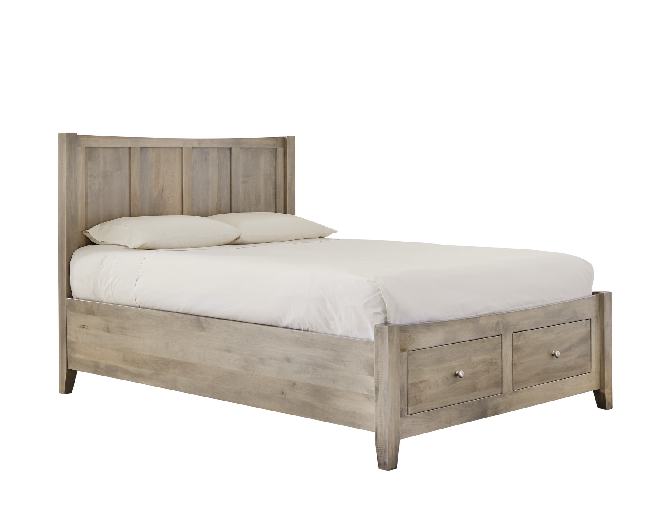 The Atwood Queen Panel Bed with Low Footboard with Drawer End features an arched carved trim in cases to add character and distinction to a design of transitional straight lines with a shaker influence.Read More