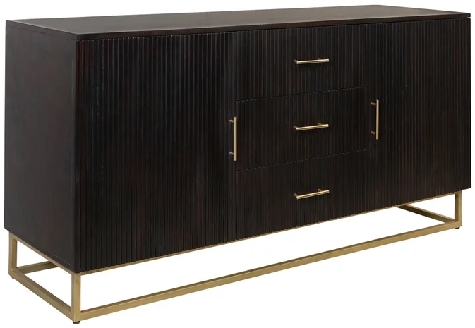 This sideboard showcases clean modern lines paired with the ebony stain finish in solid mango wood. Its hardware gold finish highlights its unique modern touch, while the floating design creates a sleek, contemporary look with ample concealed storage for dining or living spaces.Read More